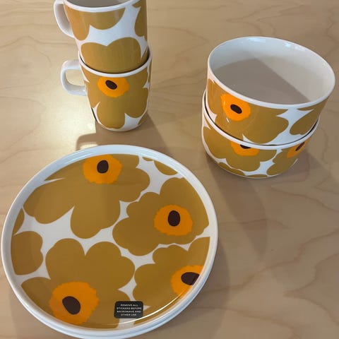6kpl halkaisija Unikko lautasia. 4 Kpl Unikko syvälautasia. 2 Kpl Unikko kulhoa. Uudet ja käyttämättömät astiat. Finish Design Shopista ostettu.