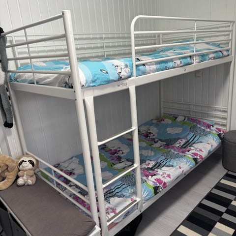 IKEA Kerrossänky metallirungolla. Sopii lastenhuoneeseen ja tarjoaa kaksi makuupaikkaa tilaa säästäen. Musta metallirunko ja tikkaat yläpetiin pääsyyn. Purettuna tällähetkellä. Vain nouto