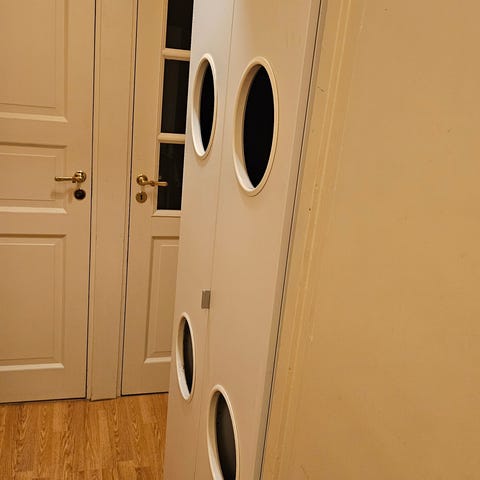 Myydään 4kpl valkoisilla kiiltävällä ovilla olevaa kaappia sisuksineen. Kaikki mukaan tuleva näkyy kuvissa. Yhden kaapin oven yksi saranoista lähtenyt irti ovesta mutta ei näytä sitä että olisi hajonnut. Kaappeihin löytyy 4 tankoa mutta vain kahdet kannattimet. Kaappien kyljissä ruuvin reikiä koska kaapit olleet toisissaan kiinni. Ovista löytyy myös jälkiä/naarmuja koska olleet lasten huoneessa.