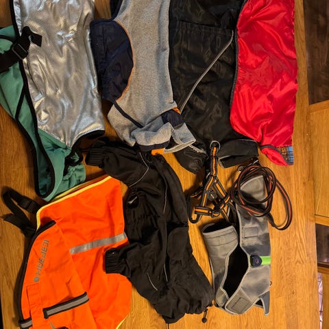 Rukka sade-/tuulihaalari, villapaita ja heijastin liivi. Kaikkia kokoa 30 (selänpituus) ja käyttämättömiä. Hinta yhteensä 20€.