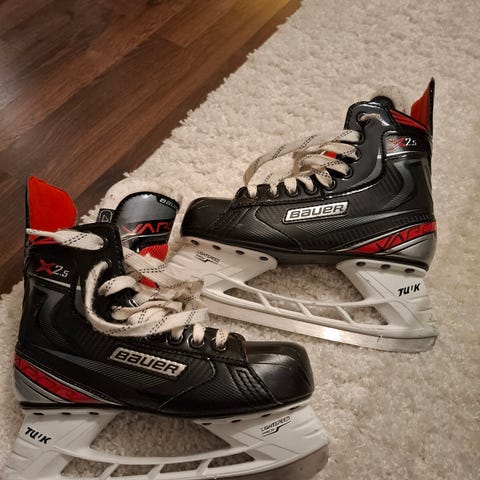 Meille pienet Bauerin XLS hokkarit koossa 35,5/36. Ihan täyttä varmuutta koosta ei enää ole, koska merkintöjä ei näy eikä laatikkoa ole enää tallessa. Sisämitta noin 22,5cm, pohjallinen ei lähde irti. Uutena meille tulleet, mutta kulumaa jo kyllä nähtävissä kärjissä muun muassa. Myös narujen päät lähteneet aukeamaan. Saa kokeilla. Suojat ei tule mukaan. Koiratalous.