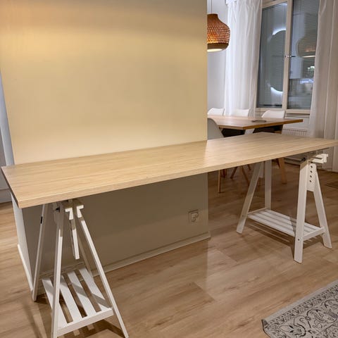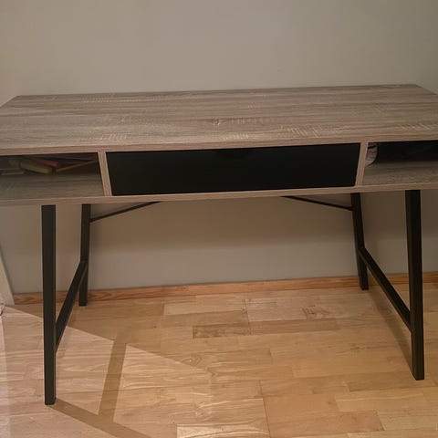 Micke työpöytä 105 x 50 cm, pieniä käytön jälkiä esimerkiksi pöydän edessä, jotka näkyvät toisessa kuvassa. Omat kantajat