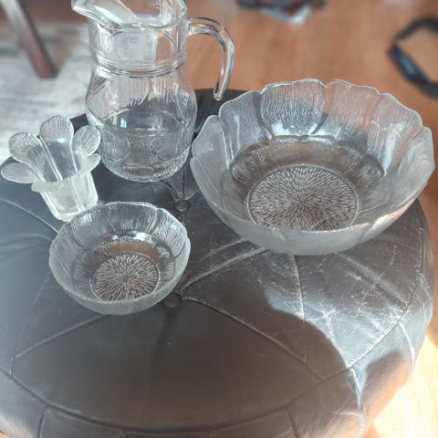 Lasiastiat, kuusi lasikuppia, joissa koristeellinen kuviointi. Kupit ovat läpinäkyvää lasia ja soveltuvat kuumien ja kylmien juomien tarjoiluun. Kaikki yhteensä 5,-