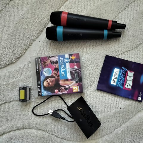 Playstation 3 singstar peli ja mikit sekä buzz musavisa peli ja ohjaimet. Buzz pelin lähetin puuttuu.