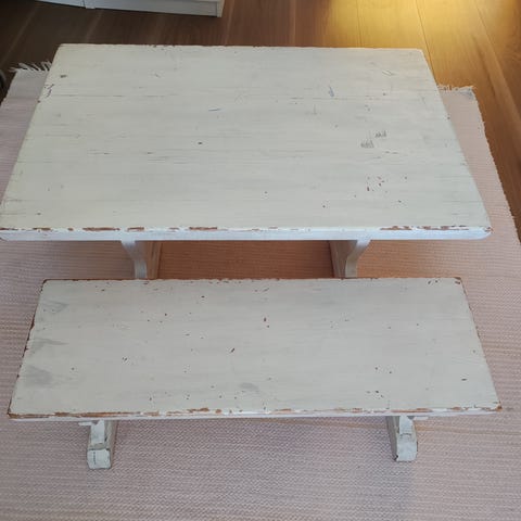 Lasten pöytä tuoleineen , koko 55cmx110cm pöytälevy , k 60cm. Tuolien koko 30cmx32cm , k 68cm.