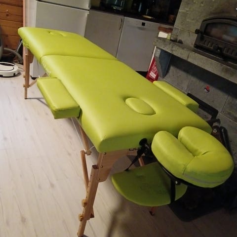 Quirumed hierontapöytä keinonahkapinnalla. Lisäosina saatavilla käsille tuet ja pidennys toiseen päätyyn. Kevyt kantaa.