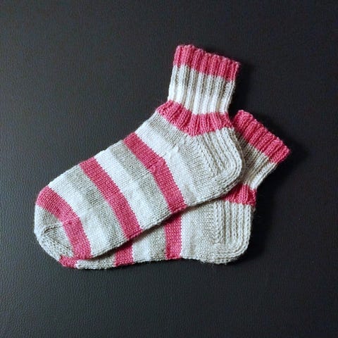 Neulottu Novitan 7 veljestä langoista (vaaleaa liila ja valkea).