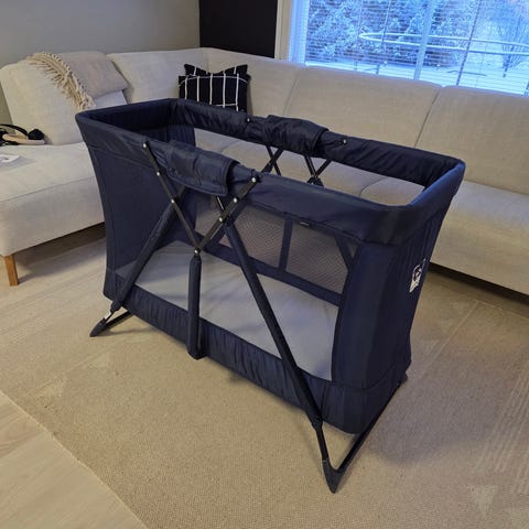 Mummola käytössä ollut matkasänky ja siihen erikseen ostettu patja. Menee väliaikoina pieneen tilaan ja tarvittaessa saa nopeasti pikkuiselle sängyn.