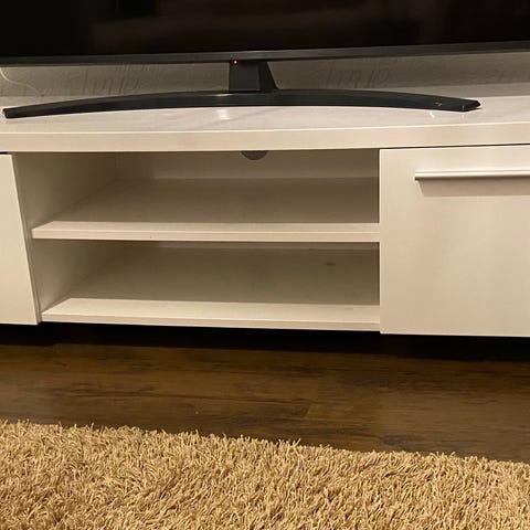 Hyväkuntoinen korkeakiiltoinen vaalea tv-taso hopeisilla vetimillä. Kansilevyssä muutama kuvan mukainen naarmu. Takalevyssä pyöreä ulosmenoaukko johdoille.