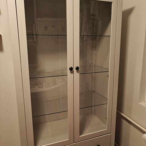 Hemnes- vitriinikaappi lasiovilla. Vitriiniosassa kahdessa hyllyssä kuvien mukaista kulumaa. Ehjä ja siisti käytetty kunto.