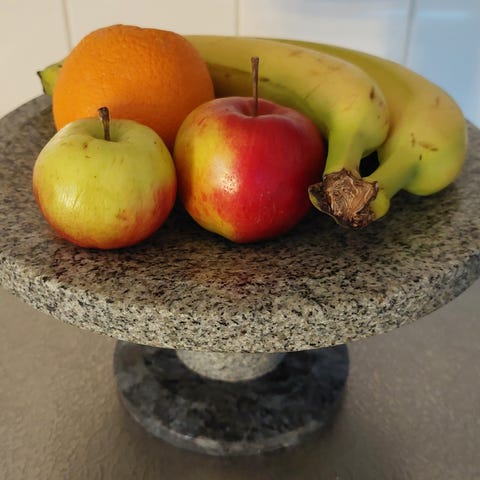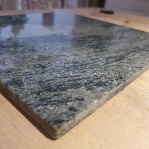 Granit tarjotin ja lautasliinat, joissa on ruudullinen kuviointi oranssin, ruskean ja valkoisen sävyissä. Tarjotin on suorakaiteen muotoinen. Lautasliinat sopivat yhteen tarjottimen kanssa.