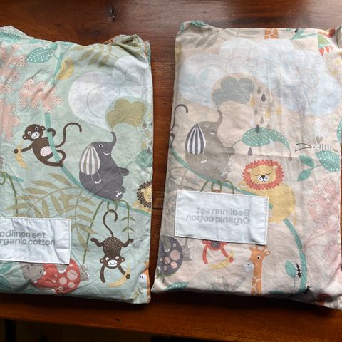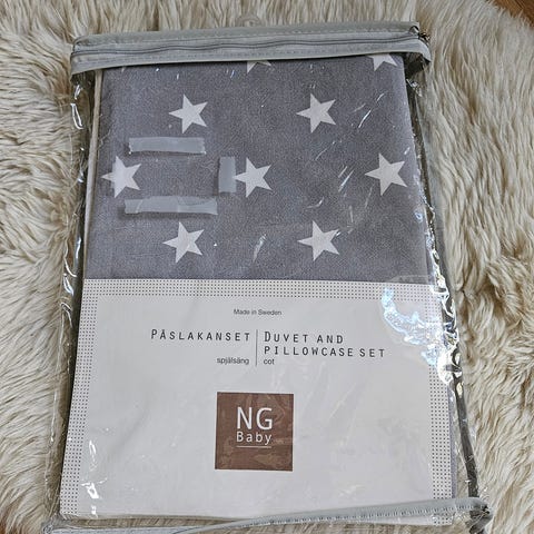 100% puuvillaa. Pussilakananassa on valkoinen yläreuna ja loput on kuviollista. Tyynyliina on kokonaan kuviollinen. Yhteensopiva äitiyspakkauksen peiton kanssa. Tyynyliinan koko on 40x55cm ja pussilakanan koko 85x128cm.