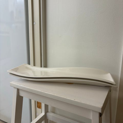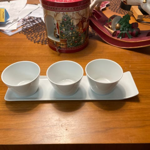 Käyttämätön antipastisetti alkuperäisessä pakkauksessa, pehmusteineen. Sisältää kolme lautasta ja kaksi pikkukippoa.