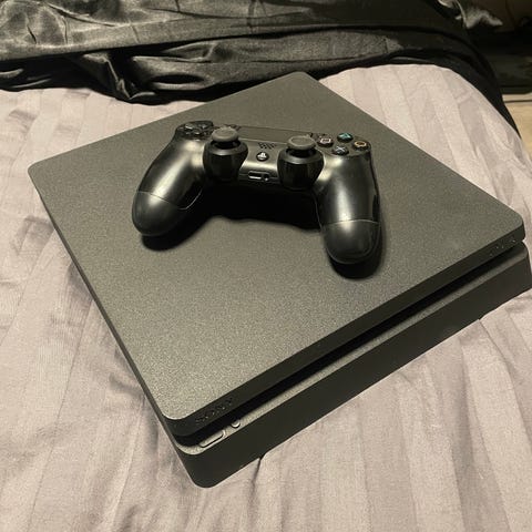 Sony Playstation 4 pelikonsoli mustassa värissä. sisältää yhden langattoman ohjaimen, josta puuttuu ohjaustatin kumi.