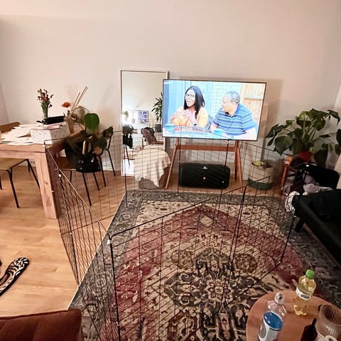 Hyväkuntoinen pentuaitaus, meillä kiinnitelty nippusiteillä jotta sai haluamansa tilan jaettua. 61 cm x 61cm, 8 aitaelementtiä. Saa myös neliön muotoon ja on ovi. Meillä näitä kaksi, yksittäin 10€ molemmat yhteensä 15€.