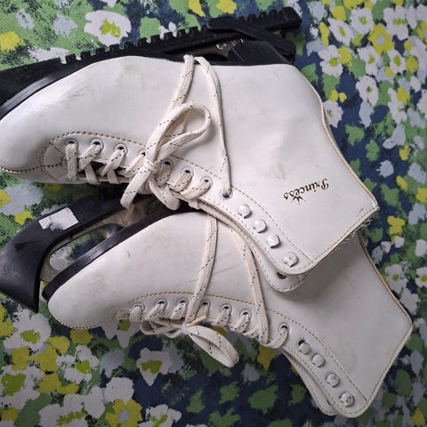 Fila lasten luistimet koko 18,6 cm, väri vaaleanpunainen. Toisen luistimen lukituspalasta puuttuu pieni pala, mutta ei haittaa lukon toimintaa. Materiaali ja rakenne tukevat jalkaa ja tarjoavat käyttömukavuutta. Nauhoja avaamalla saa kengän pituutta säädettyä.