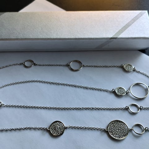 Hopeinen Kaulakoru Halkaisija 460 mm. Valmistajan leimalla KJ 925. Ketjussa on pieni tähti, josta riippuu lyhyt ketju ja sen päässä iso tähti. Ison tähden halkaisija - 34 mm. Hyväkuntoinen ja siisti kokonaisuus.