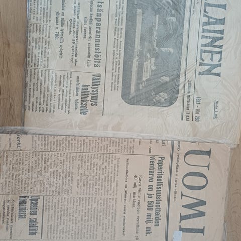 Myydään kaksi Uusi Suomi -sanomalehteä (N:o 349 - 1930 ja N:o 5 - 1931). Lehtien kunto on kohtalainen. Uudemmassa painoksessa repeämä keskiosan poikittaistaitoksessa sekä ylä- ja alakulmissa taitokset. Alakulmasta tekstin ulkopuolelta puuttuu nurkkapala. Lehtiä säilytetty taitettuina, joten pitkittäissuuntaiset taitokset näkyvät. Myös ajan vaikutus kellertänyt paperia.
