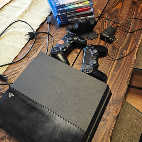 Mukaan tulee kaksi ohjainta, kaksi peliä: "Grand theft auto 5" ja "Crash bandicoot", lisäksi virtajohto,Hdmi-johto ja usb-johto ohjainten lataamiseen.