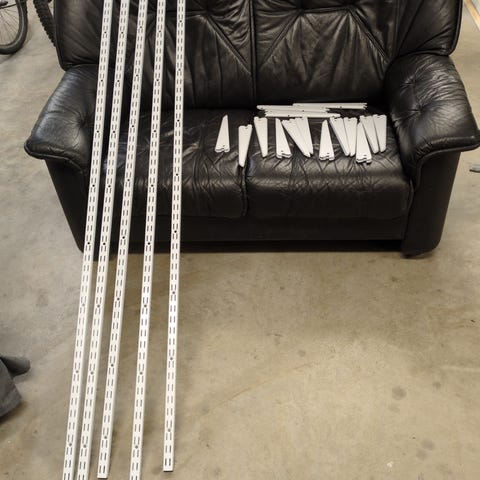 Myydään kuvan ruskeat hyllykannatimet kiskoon.