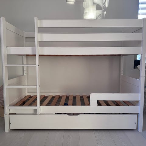 Mukaan tulee Ikean patjat (kavennettu sänkyyn sopiviksi) ja erilliset Ikean patjansuojukset, sekä itsetehdyt tikkaat, joita voi säilyttää päädyssä. Patjat ja suojukset täysin puhtaat ja tahrattomat. Sängyissä vaneripohjat.