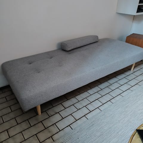 Divaani, jossa tummanharmaa kangaspäällinen ja säilytystila istuimen alla. Koirataloudessa ollut.