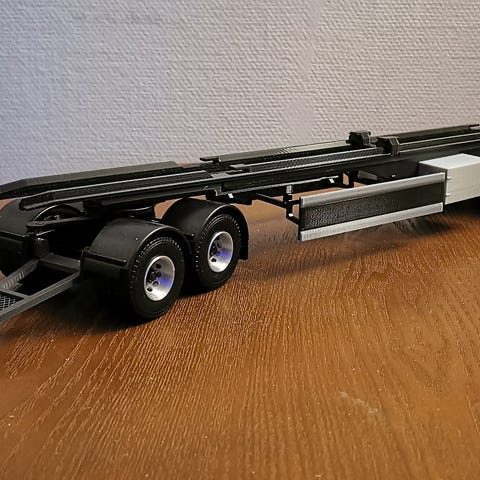 Jatkettu viisiakselinen kärry, sopii kaksi Emek vaihtolavaa kyytiin. Kiskoissa kiinnikkeet vakiolavojen mukaan. Myös vanteet uusittu ja aisa pidempi.