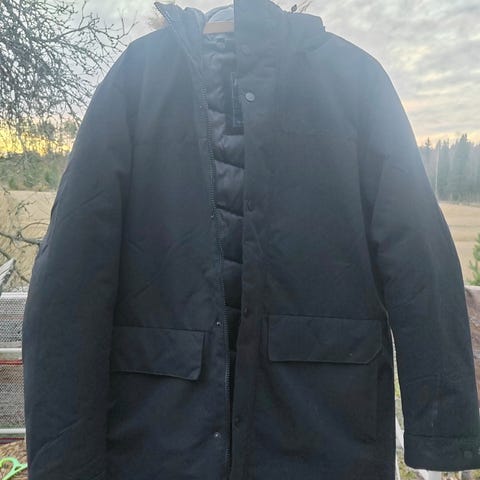Harmaa talvitakki, koko M. Todettu liian lyhyeksi malliksi meidän 180 cm nuorelle, mutta jäi palauttamatta. Koira- kissatalous, takki tosin roikkunut vaatekaapissa, jossa koira tai kissa eivät oleskele. 😀