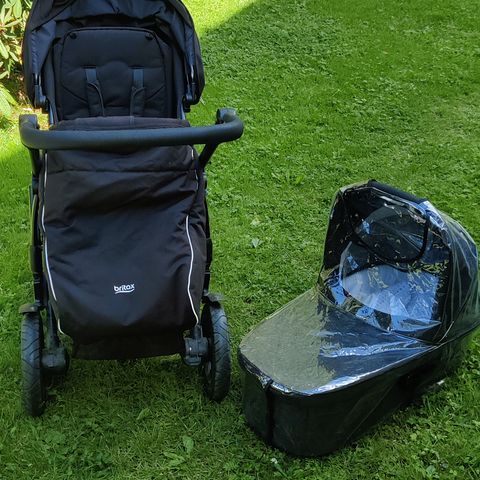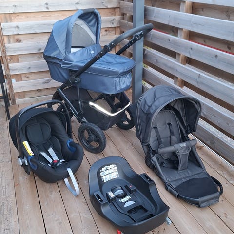 Britaxin starttipaketti, jossa vaunukoppa, rattaat ja autoistuin, kaikki osat saa kiinnitettyä samaan runkoon. Renkaat suuret ja tukevat. Eturenkaat pyörivät, mutta ne saa myös lukittua. Mukana sadesuoja.