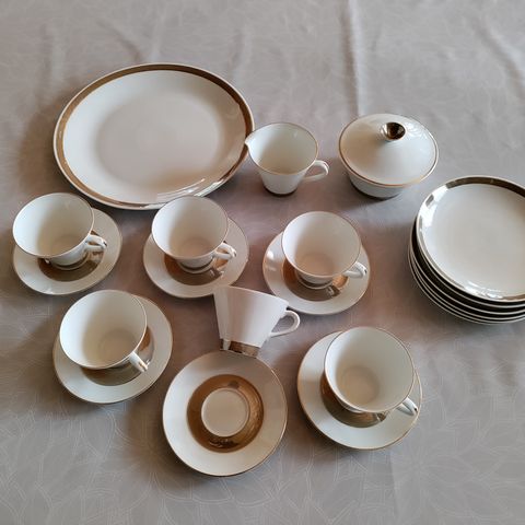 Arabia Kaleva kahvikuppeja 9 kpl, aluslautasia 7 kpl, kakkulautasia 5 kpl, tarjoilulautanen, sokerikko ja kermakko (+aluslautaset näille). Joissakin kuvioissa iän tuomaa kulumaa. Huomioitu hinnassa. Kaikki yhteensä 25€.