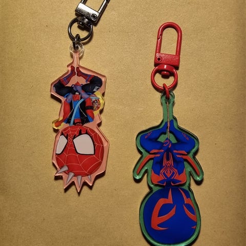 Spiderman 2099 (Into The Spider-Verse elokuvasta) fanitaide avaimenperä. Sama kuva molemmilla puolilla (kuten myynti ilmoitus kuvassa näkyy). Korkeus n. 7cm. Materiaali akryyli muovi. Itse digitaalisesti piirrettyä chibi Miguel O'Hara fanitaidetta.
