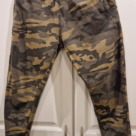 Hyvässä käytetyssä kunnossa olevat maastokuvioiset collegehousut. Ei kulumaa polvissa tai pepussa, mutta pesunukkaa tummissa kohdissa. Merkki Next.