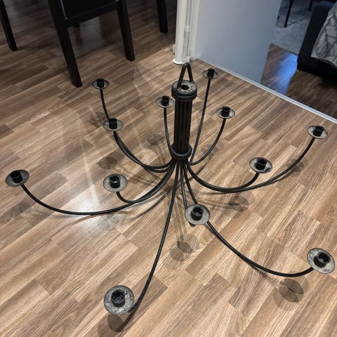 Viidellä irroitettavalla lasikupilla varustettu kynttiläkruunu. 107 cm korkea ja 44 cm leveä. Lasimaljat ehjät. Vain nouto.