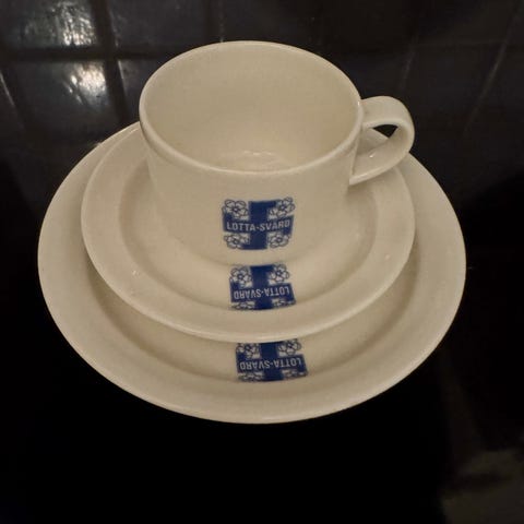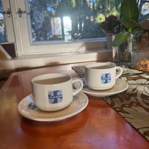Alkuperäiset, uudenveroiset Arabian Lotta Svärd kahvikupit sekä asetit.