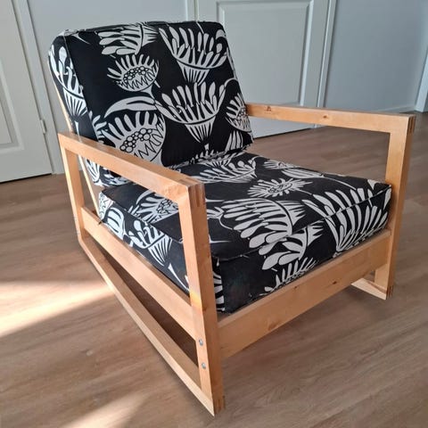 Ikean poäng-merkkinen keinutuoli, tammenvärinen runko, musta pehmuste. Kissatalous. Istuinpehmuste ehjä.