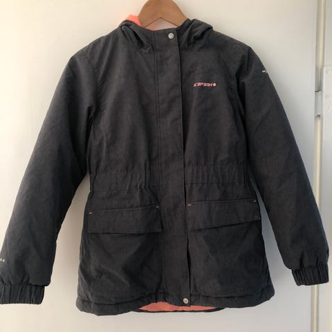 Lasten toppatakki 140 cm, noin 9-10 vuotiaille. Huppu, nepparitaskut, selässä karvavuori. Hyväkuntoinen.