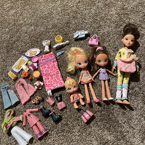 4 nukkea settinä ja sekalainen kasa Bratz nukke tavaroita ja asusteita (vaatteita, kenkiä, asusteita jne ).