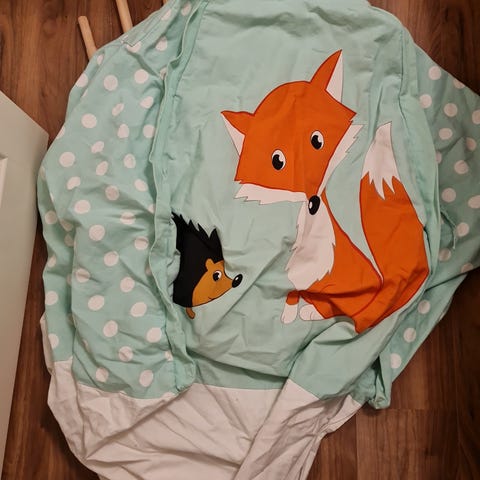 Lasten leikkiteltta, tiipii-mallinen. Kangas puuvillaa eli sisäleikkeihin. Yksi tukipuista on katkennut, sen voi vaihtaa tai teltan voi myös tukea esim. seinää vasten.