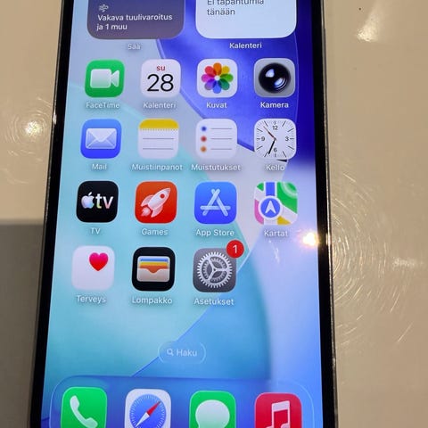 Juuri huollettu iPhone 12 Mini 128Gb sininen takamus. Puhelimeen on vaihdettu juuri uusi akku, eli kunto on 100%🔋.