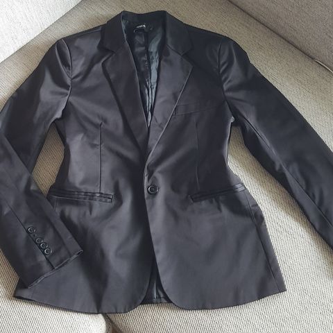 Myydään musta bleiseri vyöllä koko xl, joustavaa kangasta.