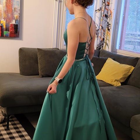 Vanhojen tanssimekko tai juhlapuku naisille, koko S. Puvun materiaali on organza ja väri vihreä. Sopii erityistilaisuuksiin kuten vanhojen tanssiin ja iltatilaisuuksiin. Mukana tulee vannehame iso ja hartiahuivi. Saa tulla sovittamaan.