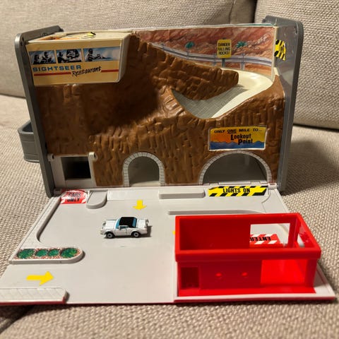 Elämän kolhima, kohtuu kuntoinen, Technofix No308 lift carage parkkitalo. v.1964. 3 autoa hissillä ylös, luiskaa alas, 1 auto puuttuu, Toimii tahmeasti, nukkunut 60 vuotta. Pit.40cm, lev.27cm.