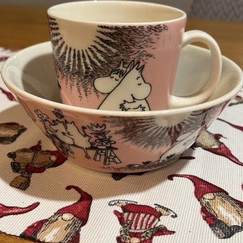 Arabia Muumi astiasto, joka sisältää mukin, kulhon ja lautaset.
