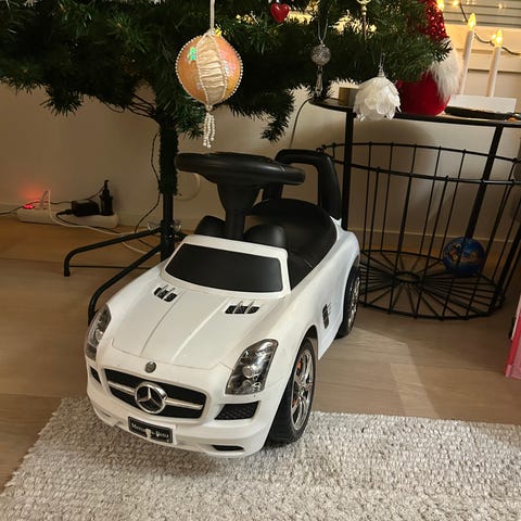 Mercedes-Benz lasten potkuauto, hopeanvärinen runko ja punainen istuin. Sopii lapsille leikkiautoiluun. Vahataan ja pestään ennen myyntiä. Loistava amg menopeli seuraavalle.
