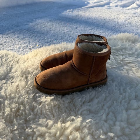 UGG talvikengät, koko 37, ruskea väri. Kengät ovat lämminvuoriset ja sopivat käytettäväksi kylmissä olosuhteissa. Materiaalina mokkanahka ja sisävuori, joka tarjoaa lisälämpöä. Kengissä on kumipohja, joka parantaa pitoa erilaisilla alustoilla. Toisessa kengässä pieni reikä mokkanahkassa, saa varmaan korjattua, mikäli häiritsee.