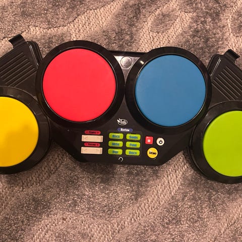 Rumpulelu, jossa neljä rumpua ja kaksi eri moodia - rumpusoundit ja hassut äänet. Kaksi eri äänenvoimakkuutta. Erinomaisessa kunnossa, mutta jalustasta puuttuu yksi osa -> ollaan muutenkin käytetty vaan lattialla ja toimii niin oikein hyvin. Nouto Puistolasta.