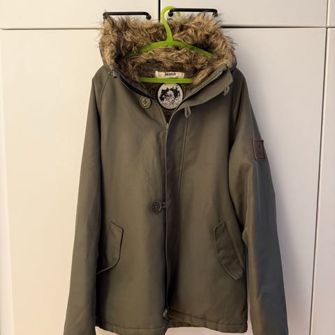 Makian lämmin talvitakki. Ollut päällä ehkä alle 10 kertaa, itselleni hieman liian lämmin. Taskuissa vetoketjut, samoin povitaskussa. Karvahuppu lumipyryjä varten. Laadukas ja kestävä takki kaikin puolin