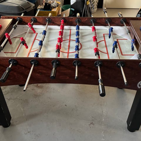 Pöytäjalkapallo peli sisäkäyttöön. Pallo mukana. Pöydän leveys 60 cm, pituus 122 cm ja korkeus 84 cm. Huomioi kuljetuksessa, että pelaajia liikuttavat sauvat ovat pöytää leveämmät. Ostaja noutaa, ei oostitusta tai kotiintoimitusta.