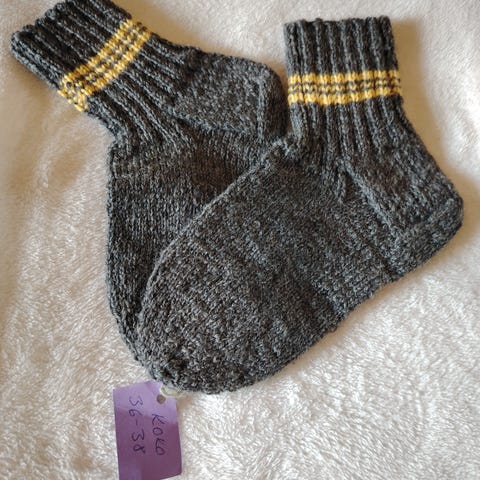 Käsin kudotut villasukat. Novita 7 veljestä lanka, oranssi varsi, sukkaosa tumman harmaa. Koko 38/40, varren pituus 17cm. Kantapää-kärki pituus 25cm. Vahvistettu kantapää.