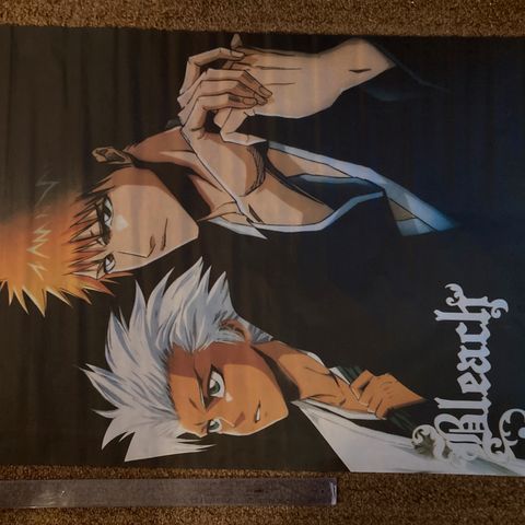 Ryūjin Manga-seinäjuliste, jossa on kaksi hahmoa ja miekka, painettu kirkkailla väreillä. Alatuki puuttuu, mikä huomioitu hinnassa